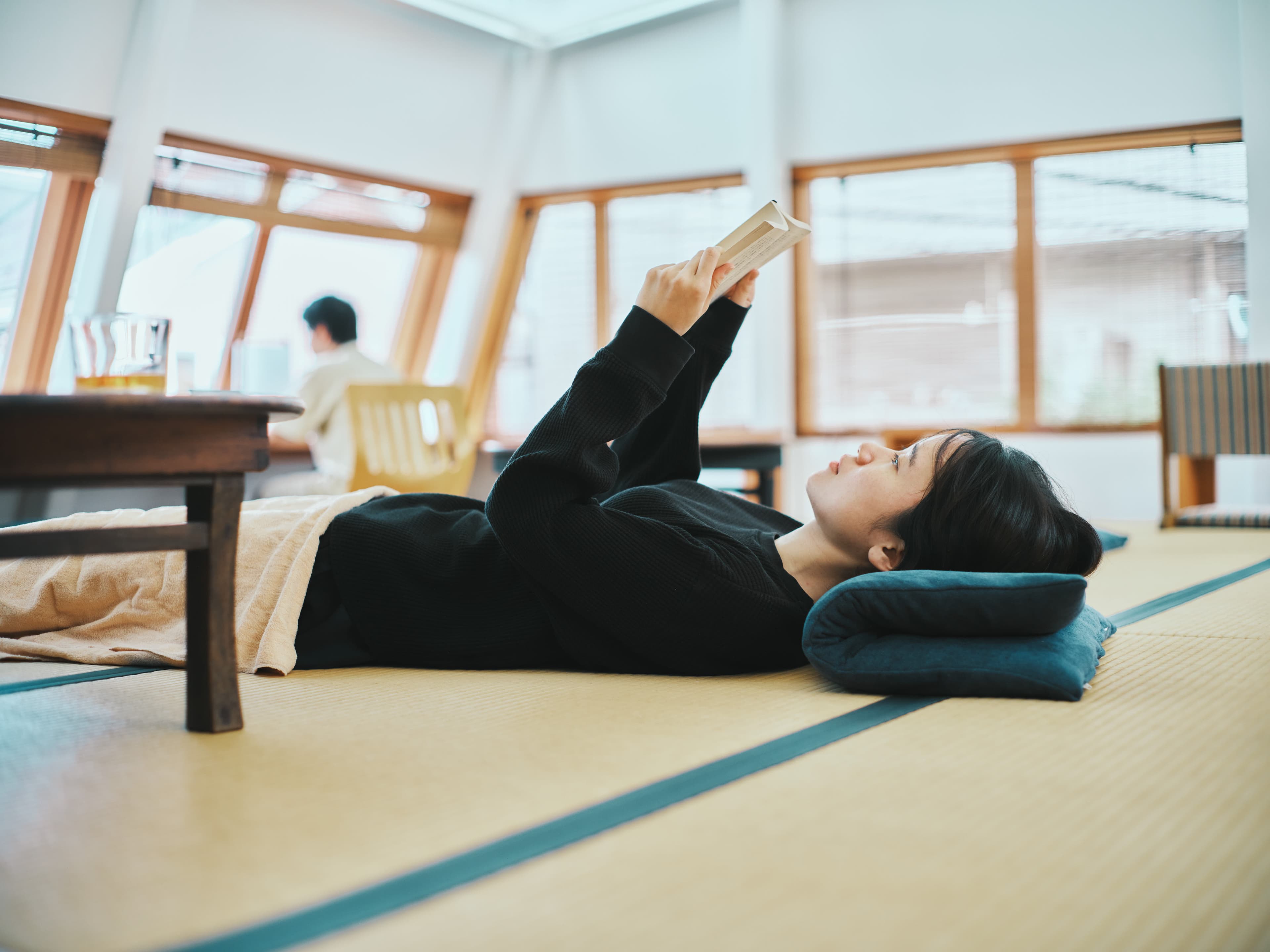 畳のワークスペースで、仕事や読書に集中できます。疲れたら寝そべってひと休み。Wi-Fi・電源・プリンターの他、本棚も充実しています。